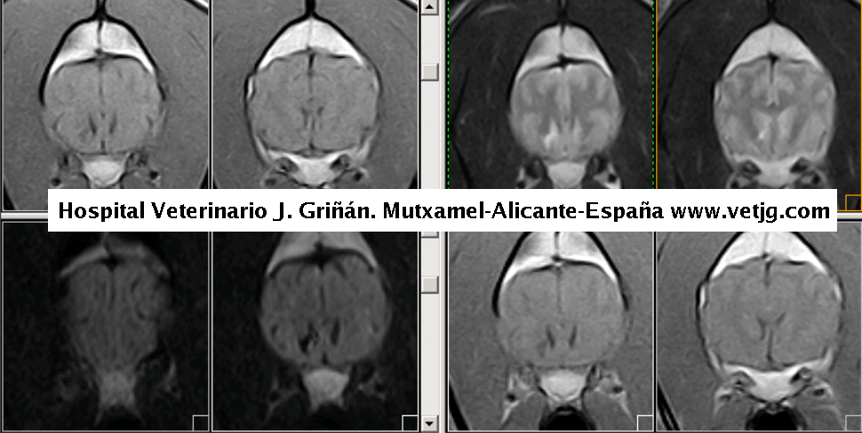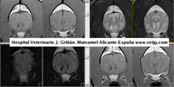 imágenes de resonancia del pastor alemán, donde es evidente la hemorragia cerebral |
