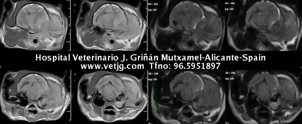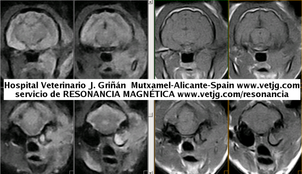 Resonancia de otro gato con el mismo cuadro clínico e imagenológico, pero más avanzado (estaba dos años con gotas para la "otitis") |