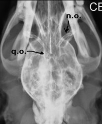 Los nervios ópticos (n.o.) y el quiasma óptico (q.o) se pueden observar en una ventriculografía (radiografía con contraste yodado aplicado en cisterna magna). Recordemos que los nervios ópticos están envueltos por meninges y por ende por líquido cefalorraquídeo.