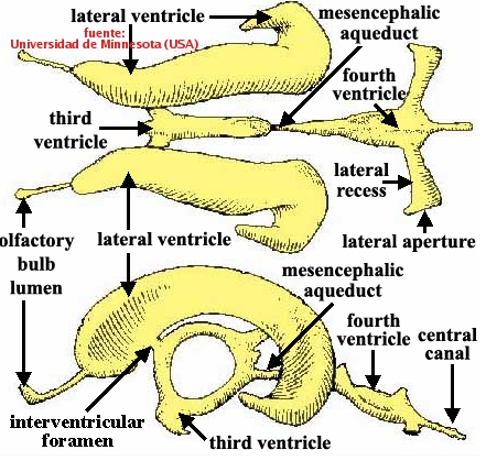 En el desarrollo embriológico se perfila la formación de las cavidades internas o ventrículos encefálicos por los que se formará y circulará el LCR. Así, el prosencéfalo dará origen a una vesícula central (diencéfalo) y dos vesículas laterales ( vesículas telencéfalicas). En el interior del diencéfalo está la cavidad o ventrículo diencefálico (llamado III ventrículo), el cual comunica con los ventrículos laterales (también llamados I y II ventrículos) de las dos vesículas telencéfalicas a través de los agujeros interventriculares o de Monro.