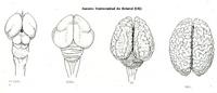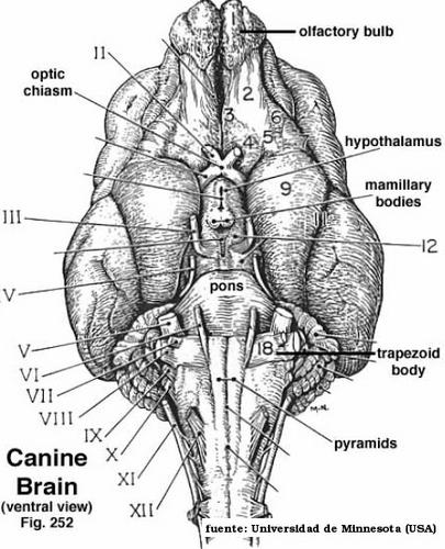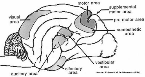 ÁREA MOTORA: localizada alrededor del SURCO CRUCIATE. Responsable del movimiento voluntario y origen de las fibras del TRACTO PIRAMIDAL que llega a los núcleos de los nervios craneales y a la médula espinal por el TRACTO CORTICOSPINAL. Este área tiene una organización somatotópica, o sea, está basada en la organización regional del cuerpo. Así, el área motora del cuello está cerca de la de la cabeza, la de los miembros posteriores está cerca de la de la cola, etc.. Esta organización se puede representar por una animunculus, el cual aparece distorsionado porque la cantidad de cortex es proporcional a la densidad de la inervación, no por el áraa de la superficie corporal.