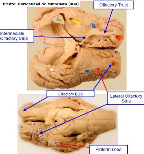 El tracto olfatorio termina por una bifurcación en la ESTRIA OLFATORIA MEDIAL y LATERAL, las cuales proyectan respectivamente al AREA SEPTAL (responsable de los reflejos olfatoviscerales) y a la CORTEZA PIRIFORME (responsable de la sensación consciente de la olfación).
