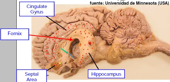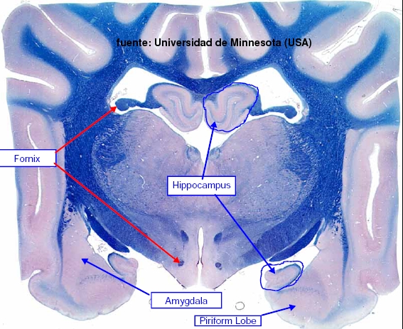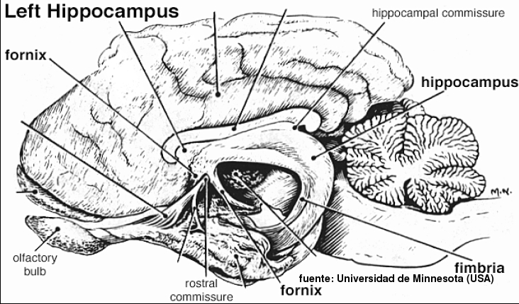 HIPOCAMPO: Es una estructura de la corteza cerebral con 3 capas de células, llamada ARQUEOCORTEX, de importancia en aprendizaje asociativo y memoria (particularmente memoria de corto tiempo). Tanto pacientes amnésicos como animales con daños en hipocampo exhiben problemas tiempo-dependientes en tareas de comportamiento generalmente descritas como asociativas o relacionadas por naturaleza. Este área del cerebro tiene un bajo umbral de ataques o convulsiones.