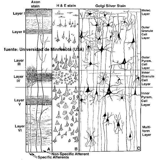 - PIRAMIDAL EXTERNA: con células pequeñas y medianas y con fibras de asociación cortas. - GRANULOSA INTERNA: con interneuronas para fibras aferentes específicas. PIRAMIDAL INTERNA: con células grandes y fibras de proyección y de asociación largas. -MULTIFORME: con células de diferentes formas y con fibras de proyección y de asociación largas.