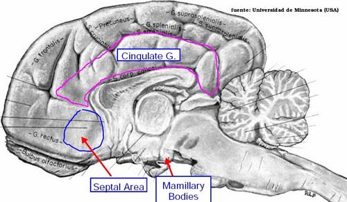 AREA SEPTAL o SEPTUM: este área de la corteza cerebral está envuelta en varios procesos fisiológicos y de comportamiento, tales como emociones, alivio del miedo, comportamiento dócil y estrés, además de en procesos de regulación autonómica ( ingesta de comida o agua, hibernación, etc..). Su estimulación lleva a un comportamiento dócil, y puede suprimir muchas respuestas autonómicas.