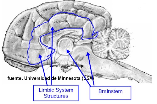 El Sistema Límbico comprende a estructuras de la corteza cerebral que bordean el tronco encefálico, junto a ciertos componentes del hipotálamo, tálamo y epitálamo, y está relacionado con la percepción de las emociones de importancia para la supervivencia del animal, como la defensa, alimentación, escape, etc.. y emociones asociadas con la supervivencia de la especie, tales como la defensa territorial, cortejo, apareamiento, etc.., estando además relacionado con procesos relativos al aprendizaje y memoria.