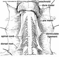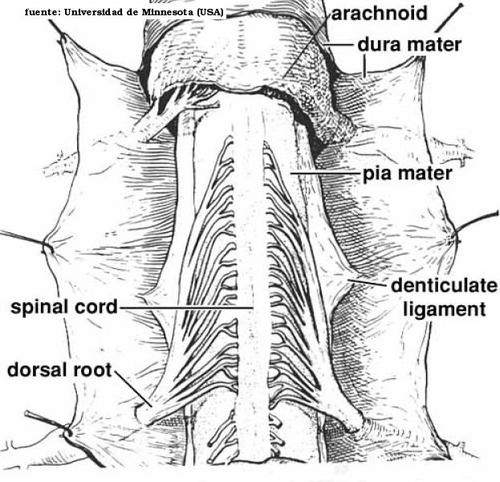 Bilateralmente la piamadre se engruesa dando lugar al LIGAMENTO DENTICULADO, el cual forma unas extensiones que atraviesan el espacio aracnoideo para fijarse a la duramadre.