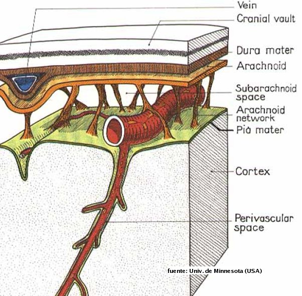 Entre la aracnoides y la piamadre se encuentra el ESPACIO SUBARACNOIDEO, por donde circula el LIQUIDO CEFALORRAQUÍDEO y por donde circulan también las arterias que irrigan a la médula espinal, las cuales emiten ramas que se introducen en el tejido nervioso.