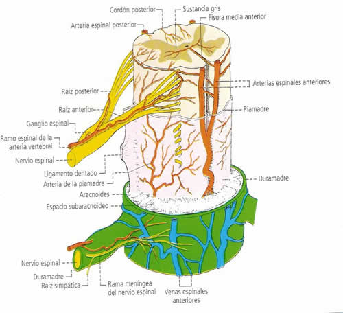 Resonancia magnética de perro cocker, a nivel de columna cervicotorácica (C5-C6) donde se muestran los senos venosos (v), hiperintensos en STIR e hipointensos en SE T2w, que circulan juntos a nivel de la mitad del segmento medular, y se separan a nivel radicular (r), describiendo un trayecto serpenteante por el suelo del canal raquídeo. Los núcleos pulposos se encuentran degenerados (relativamente poco intensos en T2w)