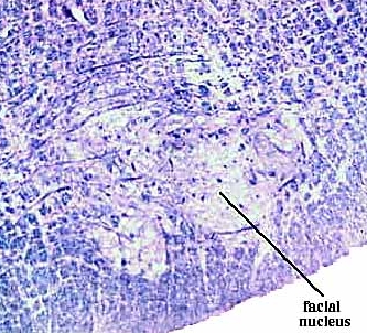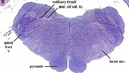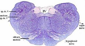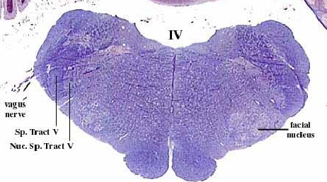 Núcleo espinal del V o núcleo del tracto trigémino, localizado en la médula oblongada, y está asociado con la sensación del dolor y temperatura de la mitad de la cara.