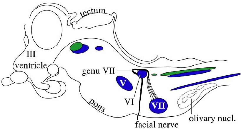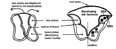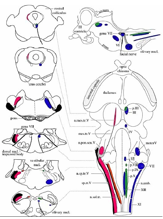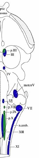 Aferentes somáticos generales (GSA): representados por el complejo componente sensorio del V, el cual está localizado bastante lateralmente al tronco encefálico.