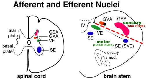 Los núcleos aferentes (que son sensitivos y son derivados de la lámina alar) consisten en cuerpos de neuronas de proyección e interneuronas, sobre cuyos axones aferentes conectan con vías ascendentes o con vías de actividad refleja.