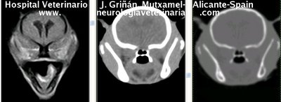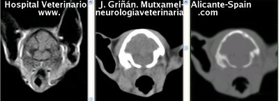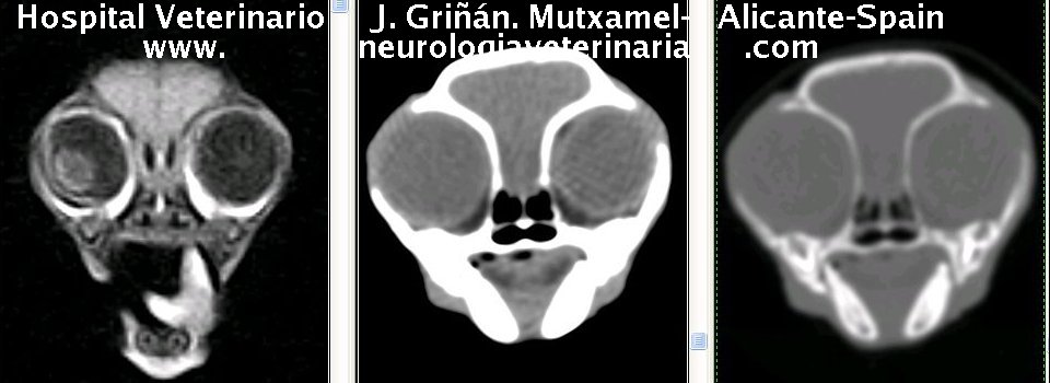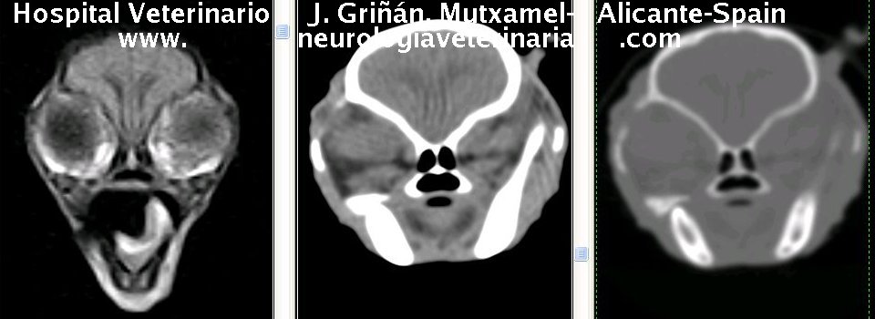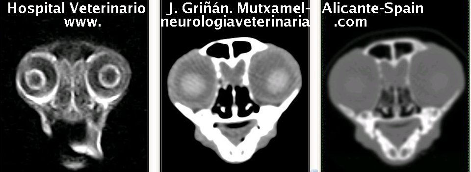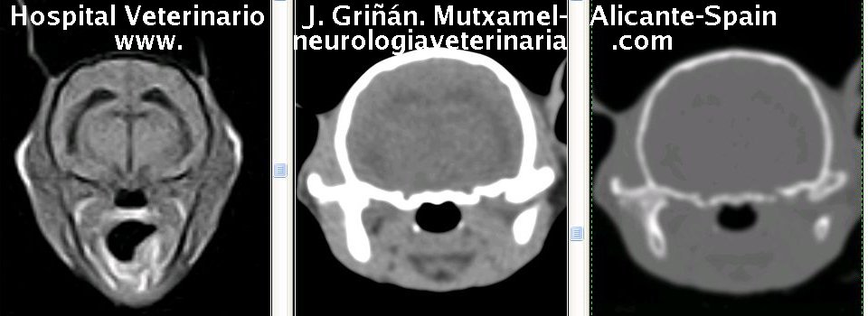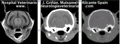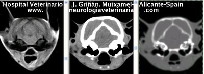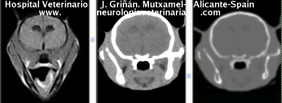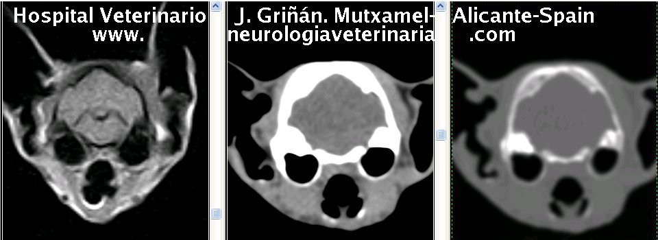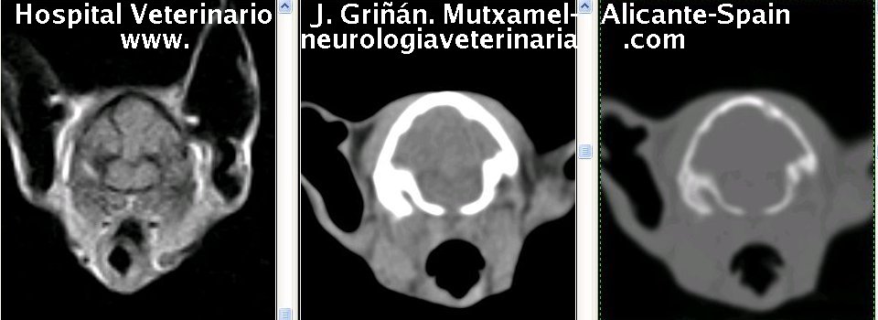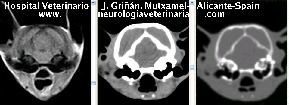 Cortes a nivel de los lóbulos occipitales del cerebro, parte craneal del cerebelo y puente. Nótense las bullas timpánicas. Nótense sendos oidos internos