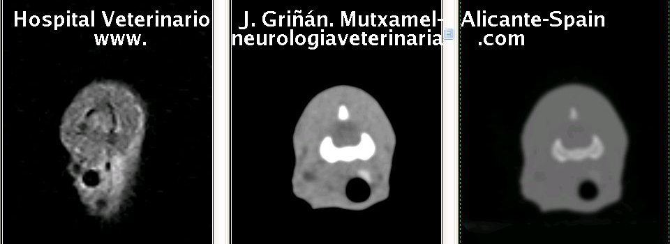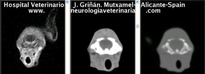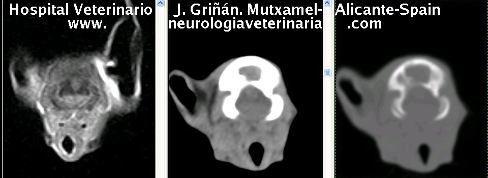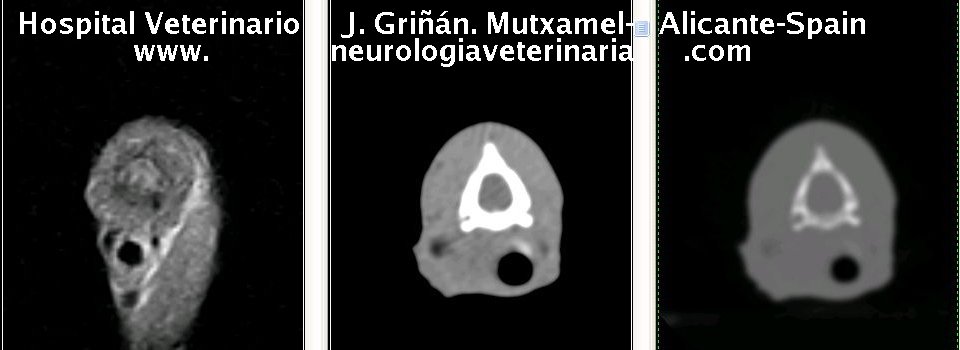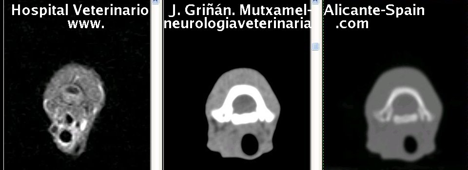 Cortes a nivel caudal de la articulación atlanto-axial (nótese el cuerpo del axis) y los agujeros de las alas del atlas. Nótese la cavidad quística dorsal a la médula espinal.