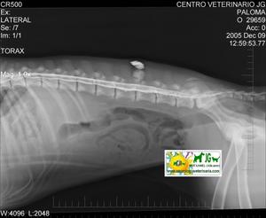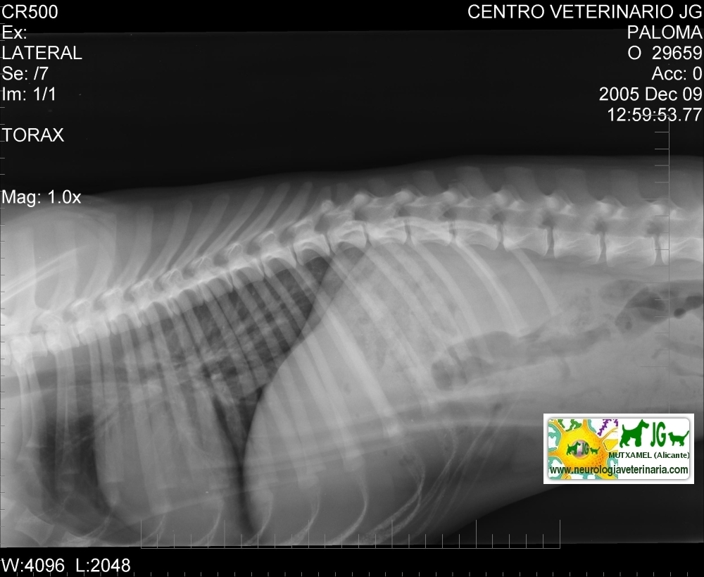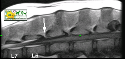 ![]() por Juan M. Griñán. Veterinario ![]() comparativa entre una mielografía (mostrando la aguja) y una resonancia magnética, secuencia SE T1w (mostrando donde está el saco dural, sitio para la inyección del contraste). Nótese la extravasación del contraste yodado en la mielografía. | |||||||||