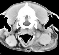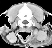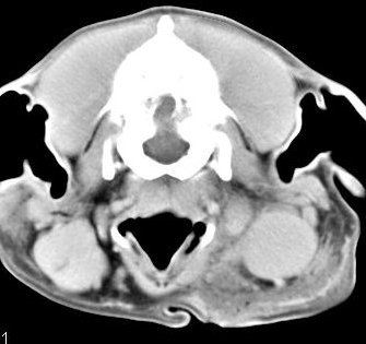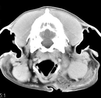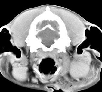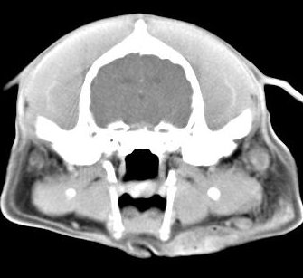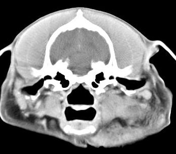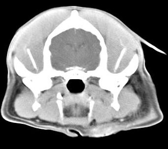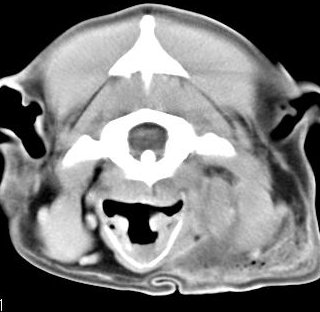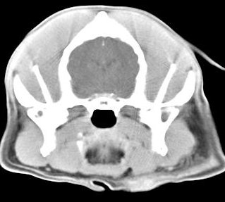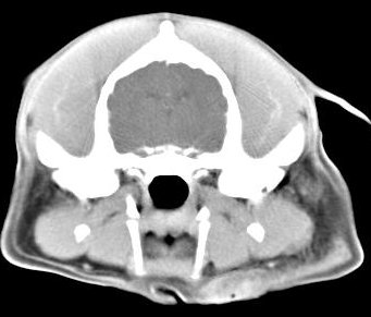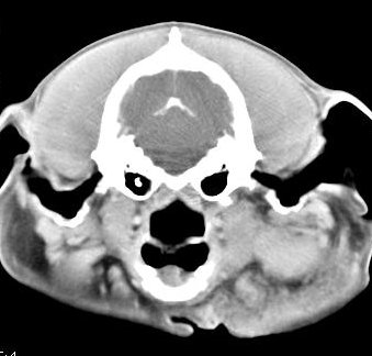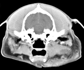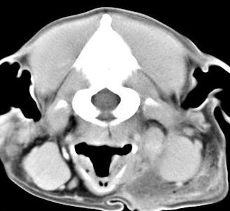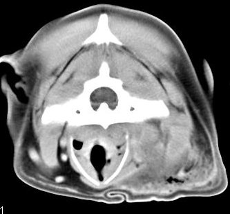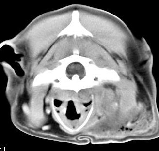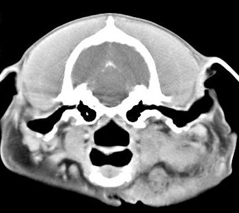 ejemplo de imágenes de TC en el perro. Nótese la celulitis en la región parotídea izquierda | ||||||||||