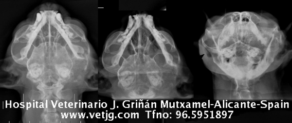 Radiografías de este segundo gato, donde observamos los focos osteolíticos y osteogénicos de la neoplasia ósea en la zona temporo-mandibular izquierda |