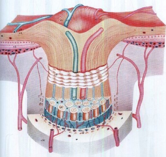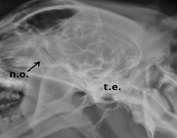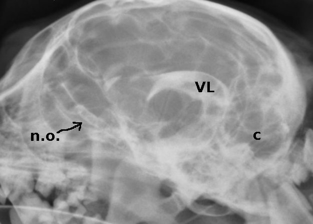 Los nervios ópticos (n.o.) y el quiasma óptico (q.o) se pueden observar en una ventriculografía (radiografía con contraste yodado aplicado en cisterna magna). Recordemos que los nervios ópticos están envueltos por meninges y por ende por líquido cefalorraquídeo.