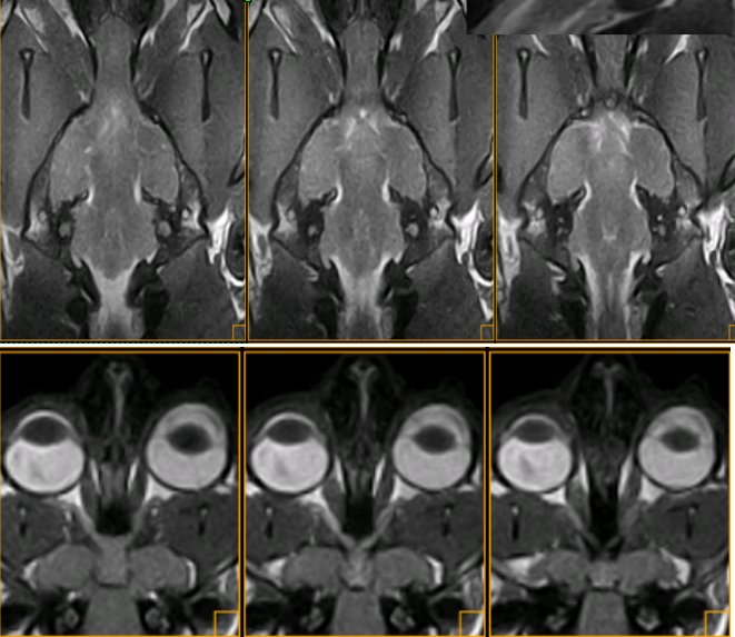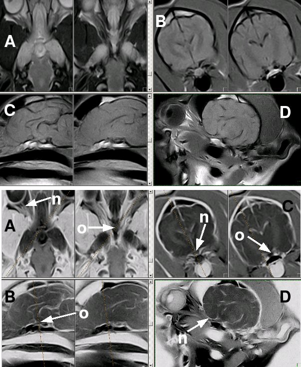 Vía óptica. Cocker. Nervio óptico (n), quiasma óptico (o) Se muestran 4 secuencias de resonancia magnética, en positivo (las de arriba) y en negativo (las de abajo) A: SE T2 dorsal. B: SE T1 transversal. C: SE T1 sagital. D: SE T1 oblícuo, siguiendo la trayectoria del nervio óptico izquierdo, del cual se visualiza perfectamente su entrada por el agujero óptico del esfenoides.