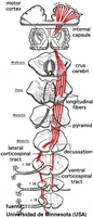 ÁREA MOTORA: localizada alrededor del SURCO CRUCIATE. Responsable del movimiento voluntario y origen de las fibras del TRACTO PIRAMIDAL que llega a los núcleos de los nervios craneales y a la médula espinal por el TRACTO CORTICOSPINAL. Este área tiene una organización somatotópica, o sea, está basada en la organización regional del cuerpo. Así, el área motora del cuello está cerca de la de la cabeza, la de los miembros posteriores está cerca de la de la cola, etc.. Esta organización se puede representar por una animunculus, el cual aparece distorsionado porque la cantidad de cortex es proporcional a la densidad de la inervación, no por el áraa de la superficie corporal.