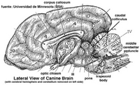LAS AREAS DE ASOCIACIÓN reciben axones de otras áreas corticales y no están envueltas en ningun procesamiento de información sensoria ni motora, si no que participan en la integración e interpretación de la información derivdad de las áreas sensorias primarias. Hay varias jerarquías de áreas de asociación: las adyacentes a las sensorias primarias (jerarquía más baja) extraen el significado de los componentes de un estímulo, mientras las de jerarquía más alta están envueltas con la planificación, reflexión, memoria, creatividad, etc.., constituyendo éstas últimas el 20% de las áreas de asociación en el perro y el 85% en los primates humanos. En humanos, el procesamiento del lenguaje (escritura, vocal, canto) ocurre en un hemisferio cerebral (en el izquierdo en el 95% de los diestros y en el 70% de los zurdos), mientras que el procesamiento visual (formas, símbolos, etc..) ocurre en el hemisferio contrario. |