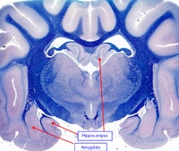 AMIGDALA: Es una región altamente diferenciada cerca del polo temporal de los hemisferios cerebrales de los mamíferos. Es un núcleo basal que está implicado en la emoción, memoria, comportamiento social, comportamiento reproductor, miedo y agresión, y modulación de sistemas autonómicos y neuroendocrinos. Muchos de sus efectos son opuestos a los del septum. Lesiones de la amígdala pueden suponer comportamiento dócil, mientras que su estimulación produce comportamiento agresivo.