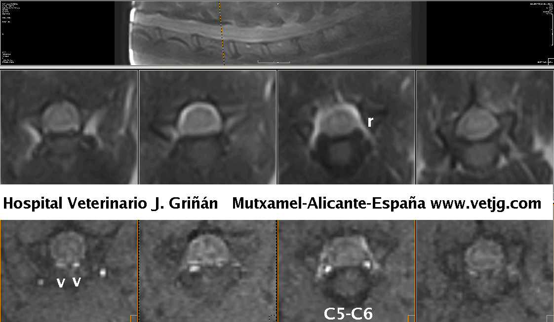 Resonancia magnética de perro cocker, a nivel de columna cervicotorácica (C5-C6) donde se muestran los senos venosos (v), hiperintensos en STIR e hipointensos en SE T2w, que circulan juntos a nivel de la mitad del segmento medular, y se separan a nivel radicular (r), describiendo un trayecto serpenteante por el suelo del canal raquídeo. Los núcleos pulposos se encuentran degenerados (relativamente poco intensos en T2w)