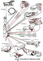 Nervio III (oculomotor): inerva 4 músculos extrínsecos del ojo: dorsal, recto medial, recto ventral y oblicuo ventral. Además inerva el músculo elevador del párpado superior. Sale por la fisura orbital.