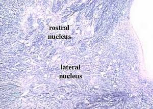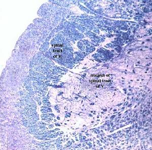 Núcleo espinal del V o núcleo del tracto trigémino, localizado en la médula oblongada, y está asociado con la sensación del dolor y temperatura de la mitad de la cara.