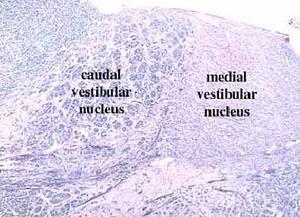 El núcleo coclear, relacionado con la sensación de la audición, y el núcleo vestibular, relacionado con el sentido del equilibrio, ambos constituidos por columnas de neuronas localizadas en la médula oblongada y que forman el nervio VIII.