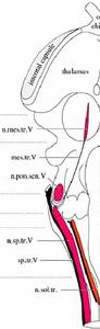 Núcleo mesencefálico del V: localizado en el cerebro medio y el cual recibe información de la propiocepción de la cara.
