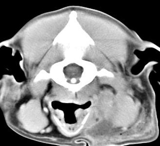 ejemplo de imágenes de TC en el perro. Nótese la celulitis en la región parotídea izquierda | ||||||||||